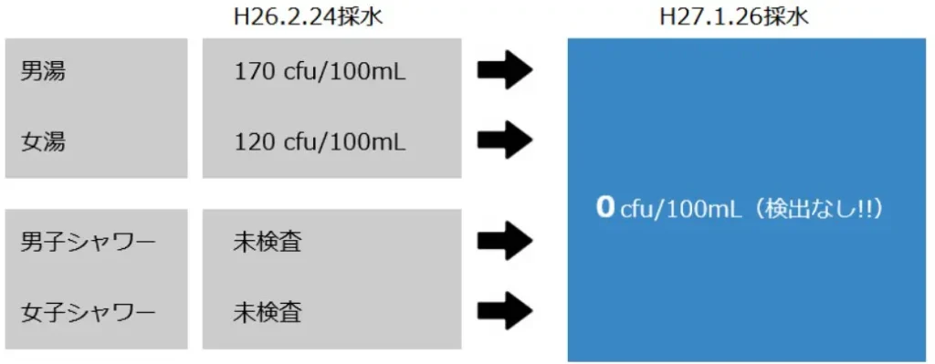 約11ヶ月後の平成27年1月に水質を再検査したところ、男女浴槽及びシャワー環境からもレジオネラ菌が一切検出されなかった。しかも泉質がいいとの評判となり効果を感じているとのお声をいただいている。